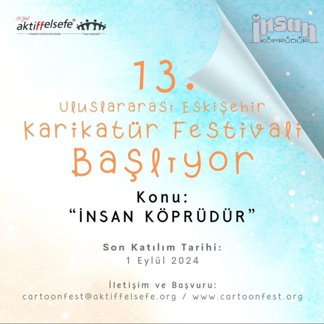 13.Uluslararası Eskişehir Karikatür Festivali Başlıyor! Uluslararası Karikatür Festivalimiz “İnsan Köprüdür” temasıyla tekrar bizlerle! Uluslararası Eskişehir Karikatür Festivali iki yılda bir düzenlenen bir kültür etkinliğidir. Her festivalde belirlenen tema için dünyanın her yerinden karikatüristlerin katılımı ile gerçekleşir. Diller, kültürler gibi birçok farklı unsura sahip olsak bile çizginin gücü festival konusu etrafında herkesi birleştirir. Festivalin bir amacı…